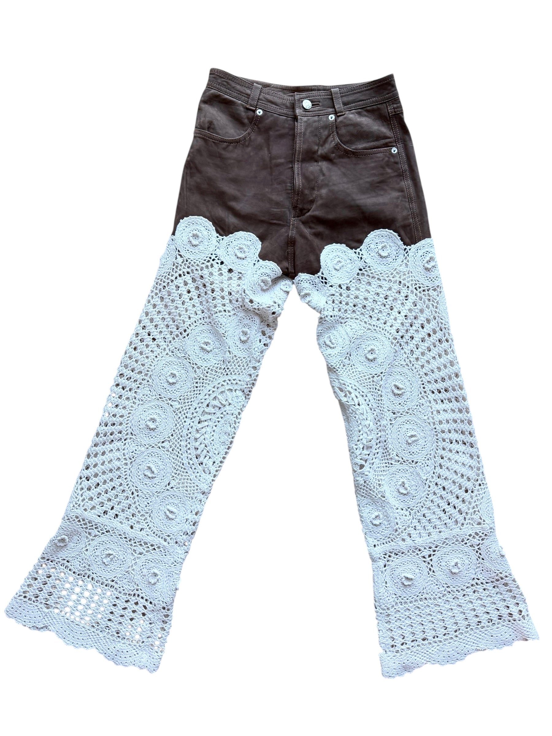 A rare fusion of edge and artistry, these vintage brown leather trousers are elevated with hand-stitched crochet panels, each piece of crochet carrying its own story. Dozens of carefully selected vintage crochet fragments are seamlessly joined together, creating a patchwork of texture that contrasts beautifully against the sleek leather. The trousers feature a flattering flared bottom, giving them a bold, retro-inspired silhouette. Every stitch is done by hand, making this a truly one-of-a-kind piece that balances rugged sophistication with delicate craftsmanship. Exquisite. Distinct. Unrepeatable.