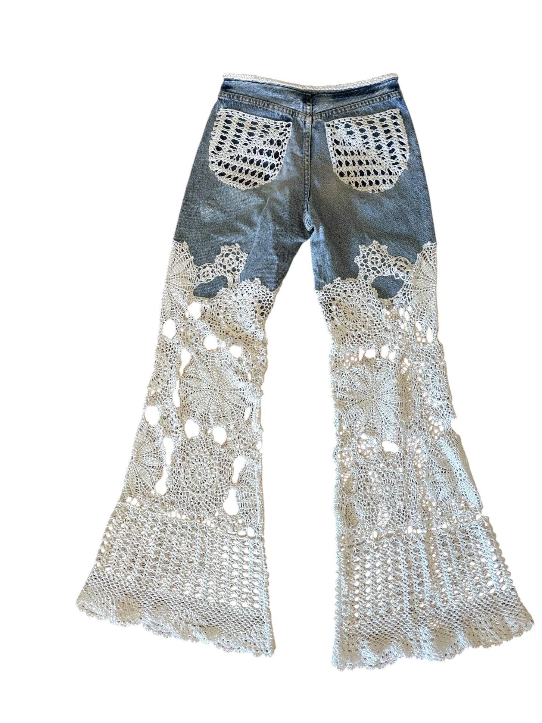 This one-of-a-kind denim is a masterpiece, blending vintage charm with artisanal craftsmanship. Featuring handmade crochet detailing along the leg, this piece offers a stunning see-through effect that adds an element of bold elegance.