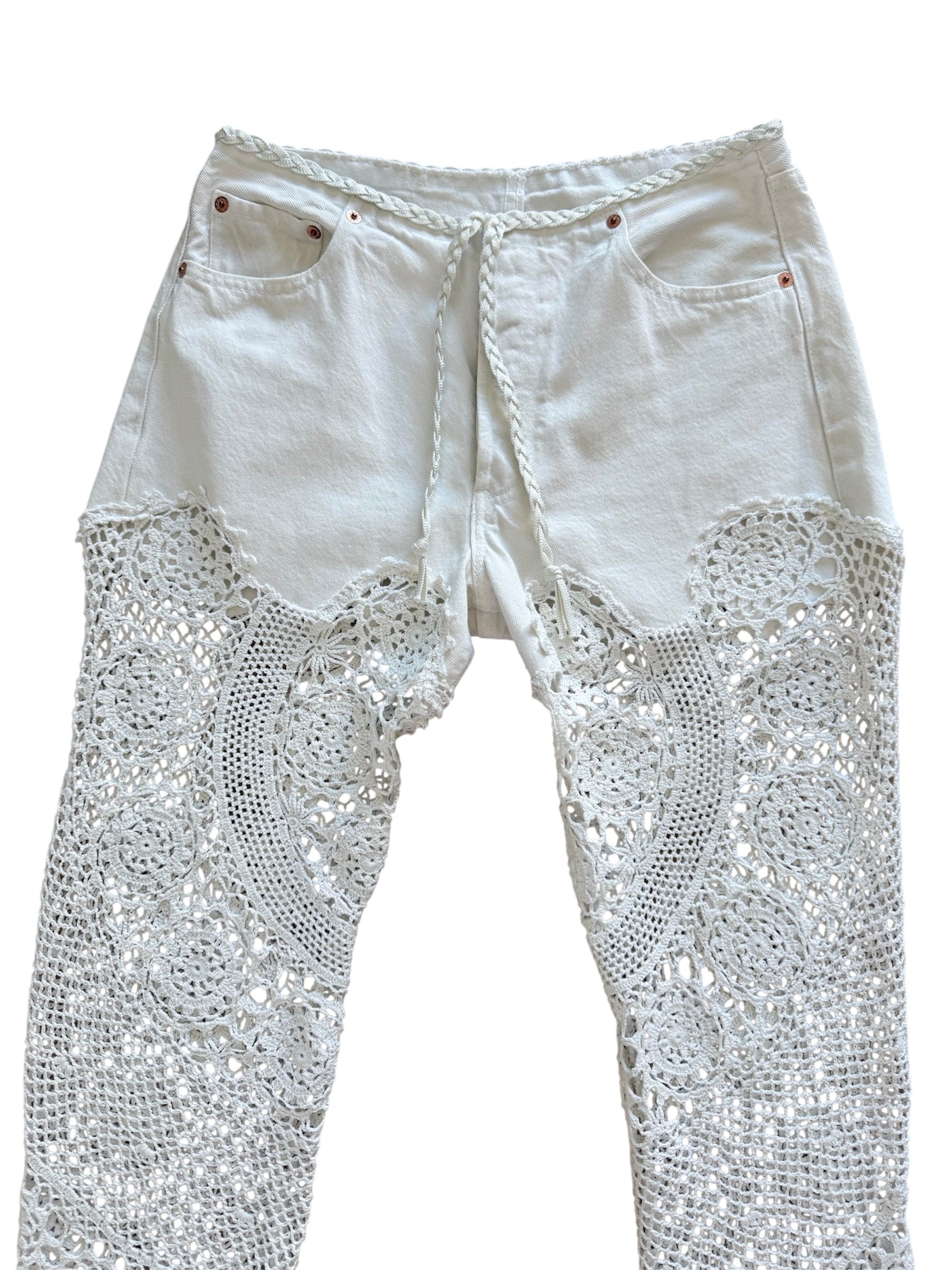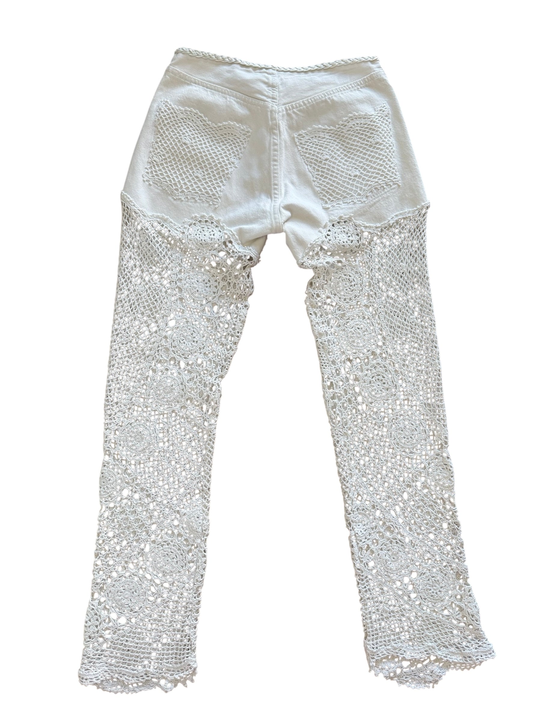 This one-of-a-kind denim is a masterpiece, blending vintage charm with artisanal craftsmanship. Featuring handmade crochet detailing along the leg, this piece offers a stunning see-through effect that adds an element of bold elegance.