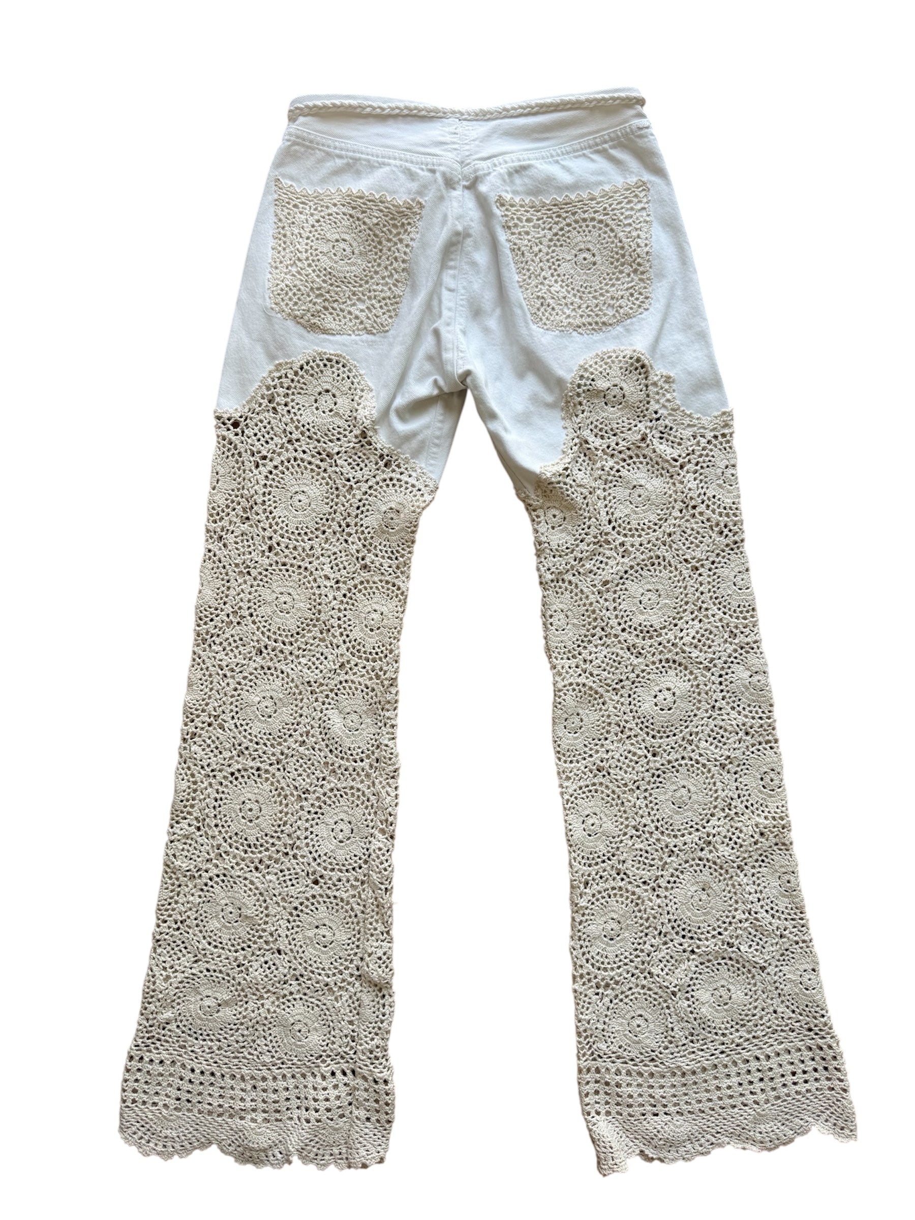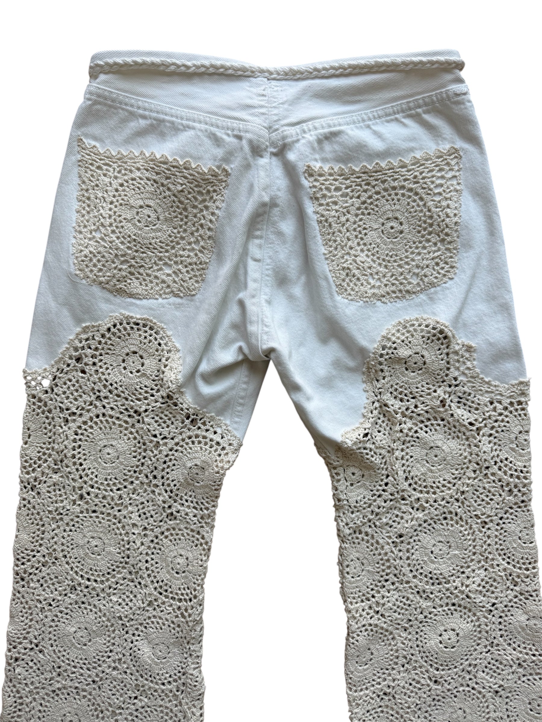 This one-of-a-kind denim is a masterpiece, blending vintage charm with artisanal craftsmanship. Featuring handmade crochet detailing along the leg, this piece offers a stunning see-through effect that adds an element of bold elegance.