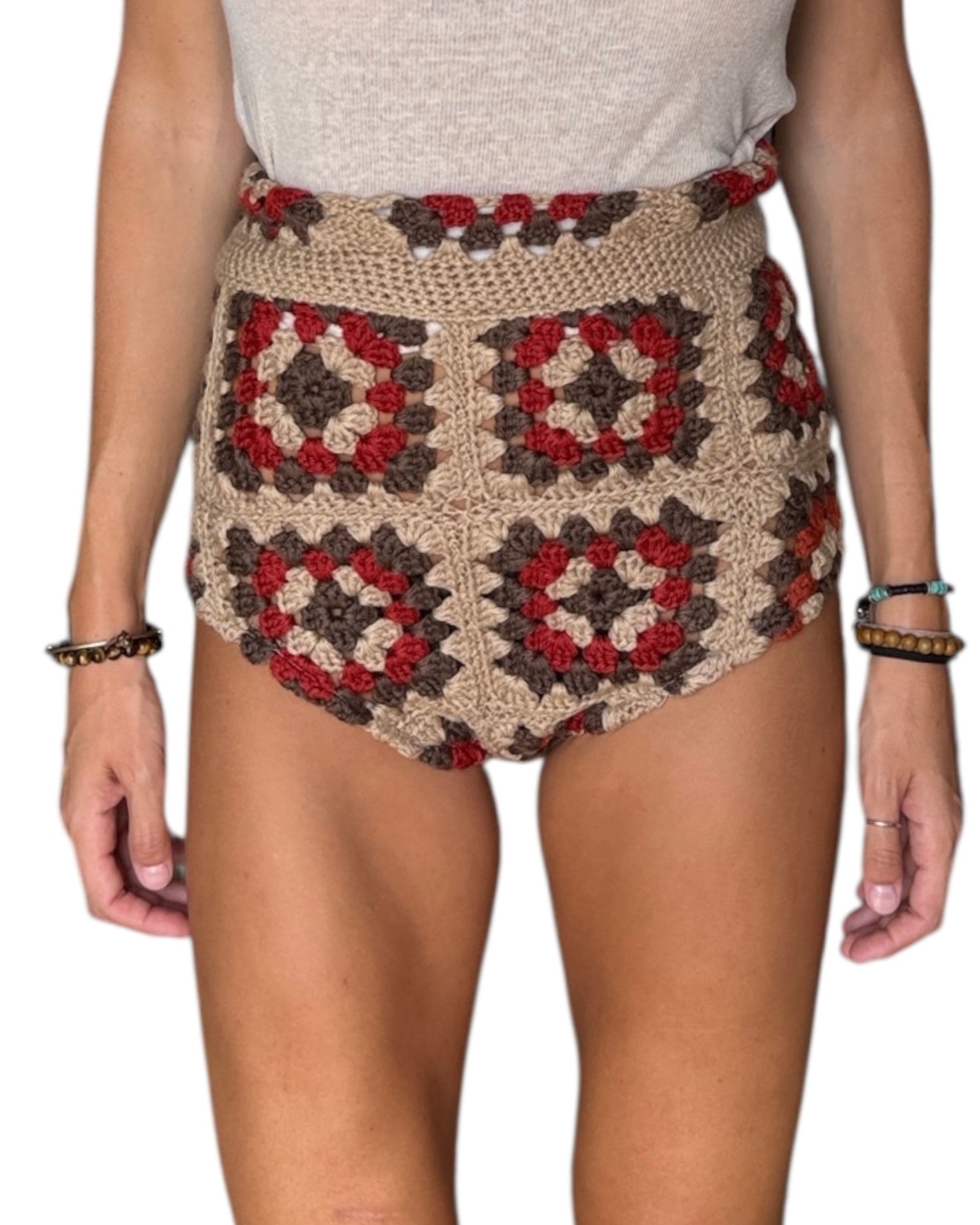 These one-of-a-kind high-waisted shorts are handmade from vintage crochet granny squares, reimagined into a bold and playful silhouette. With earthy tones of beige, brown, and red, the patchwork design brings a nostalgic 70s spirit while feeling fresh and modern. The fitted cut highlights the artisanal texture, making this piece both statement-making and wearable.